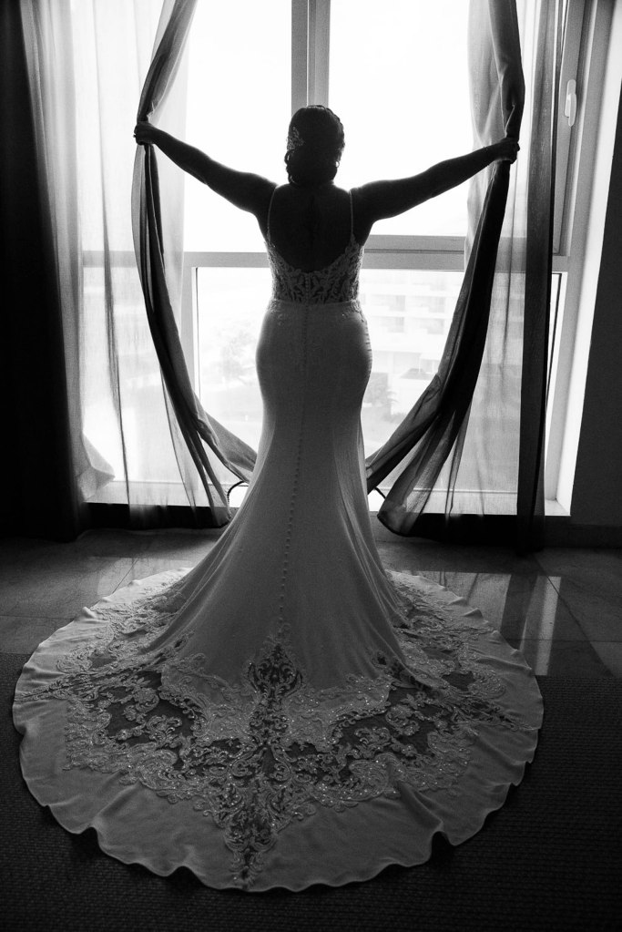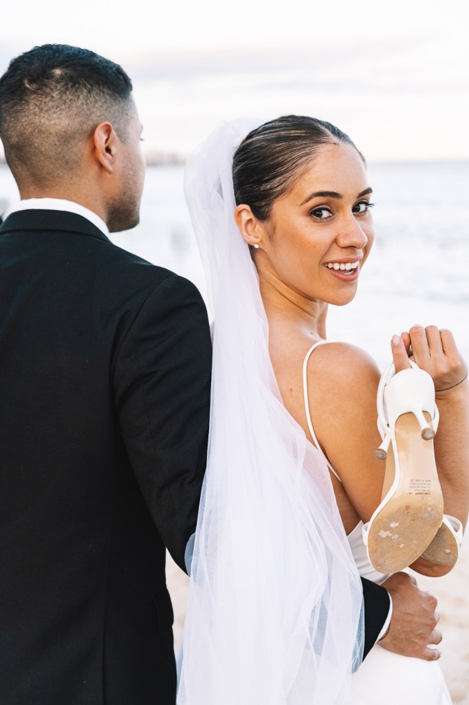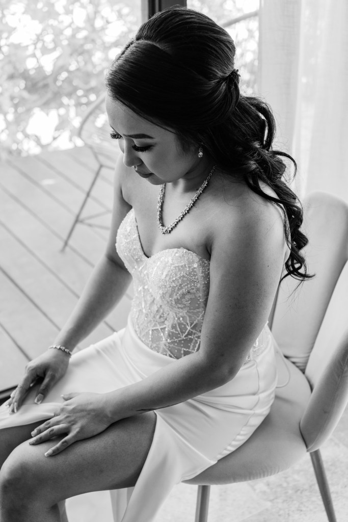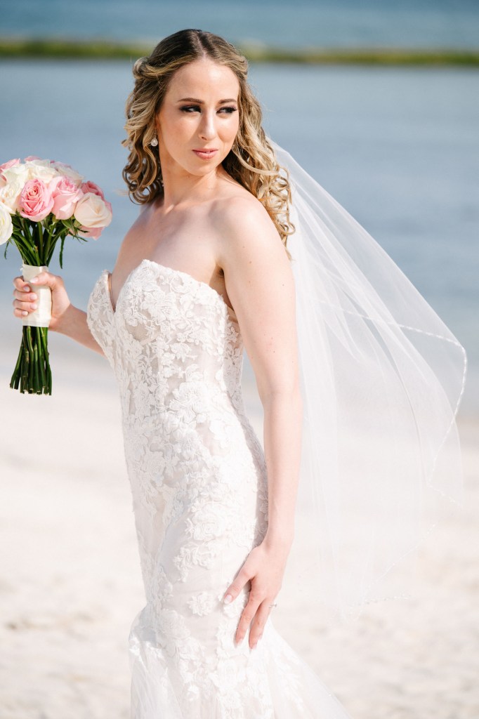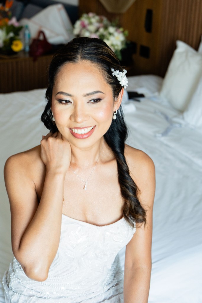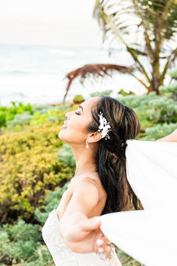 In this tropical paradise, the bride’s gown becomes her ally. Light, flowing fabrics move with the sea breeze, creating shapes and reflections as if painted by nature itself. Every detail—a fresh flower in her hair, a veil brushing the sand, bare feet meeting the ocean—tells a story of freedom, femininity, and authenticity.