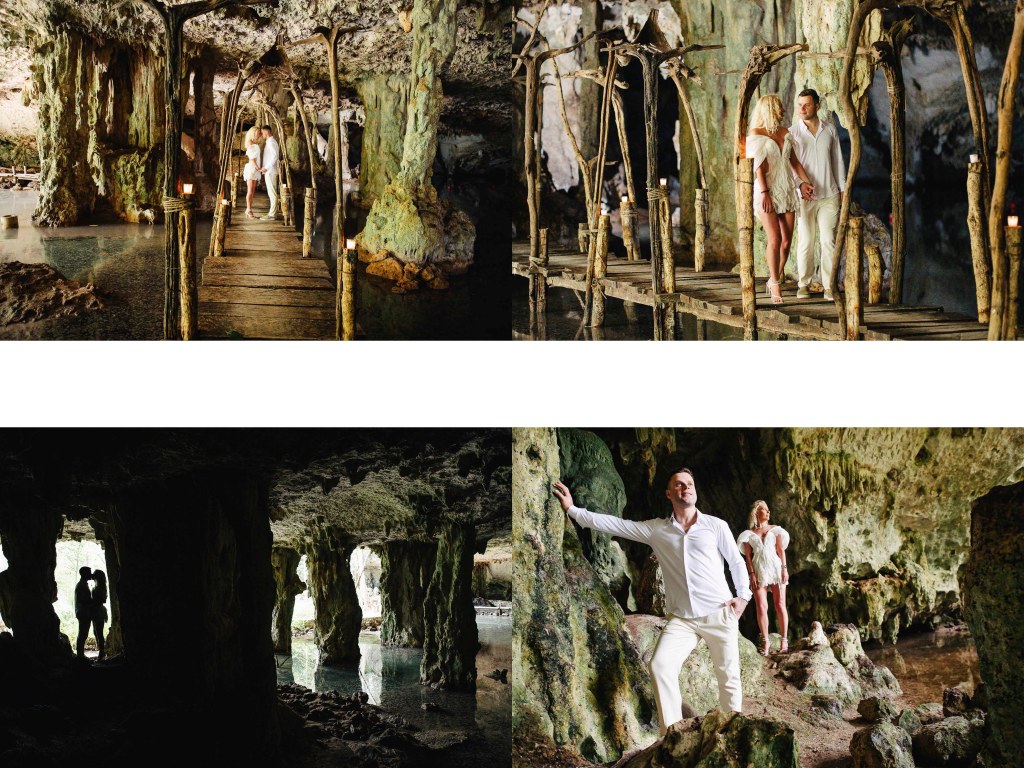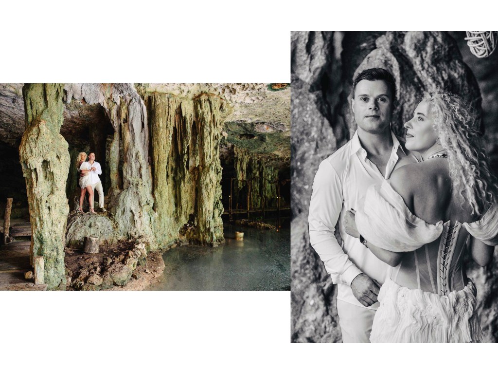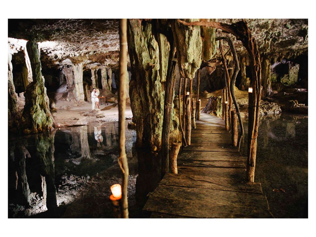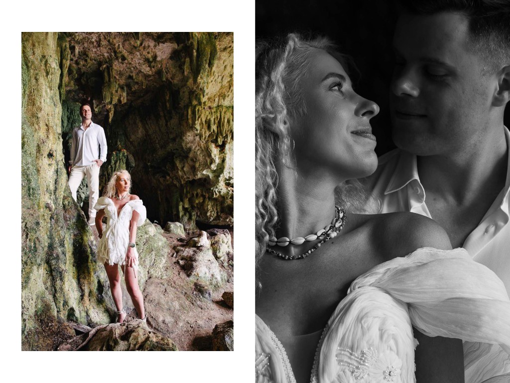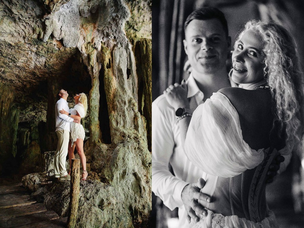 Natural light filters through the cave entrance, slowly illuminating the stone columns and creating beautiful reflections along the cave walls. The crystal-clear water and the quiet energy of the place make it an extraordinary setting for an intimate celebration.